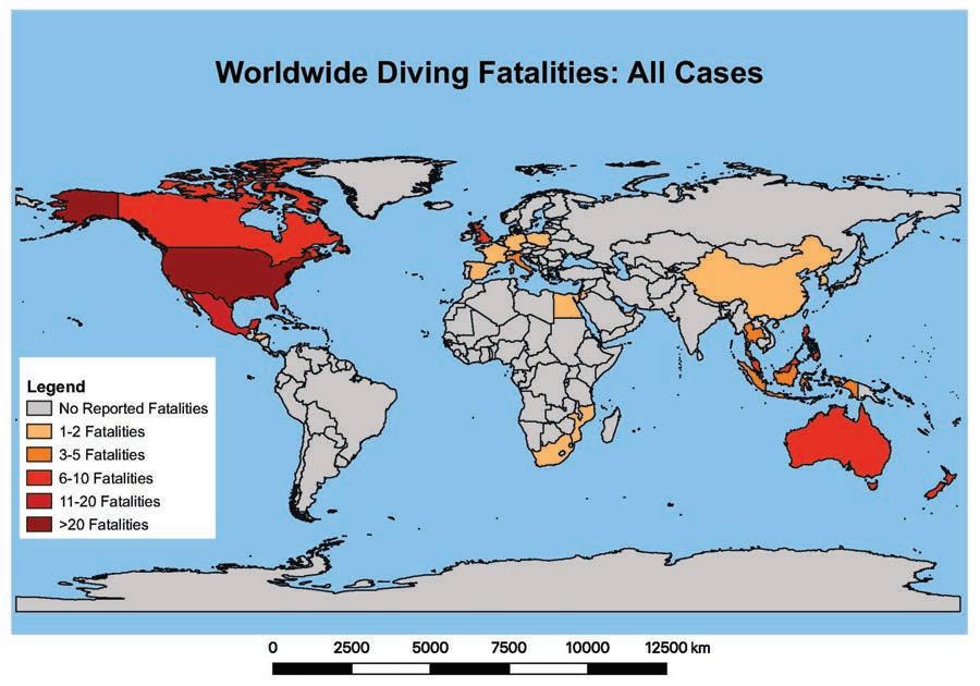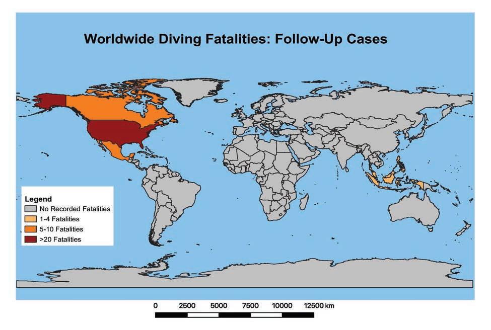 Map 1-2. Number of follow-up scuba fatalities in the United States, Canada and other countries for 2018