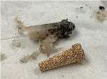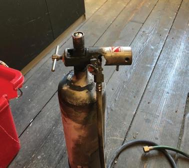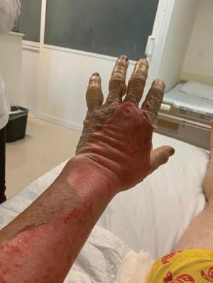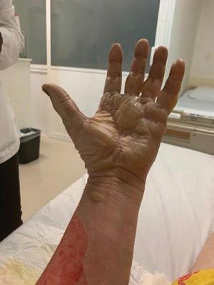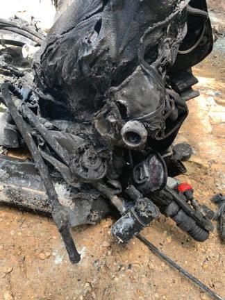 Pictures A-6: Victim and equipment after an oxygen fire (Case 6); A-C) Severe burns to hand, forearm and face. Credit F. Rueda; D) Burned inlet filter element next to new filter element. Credit AP Diving; E-F) Total destruction of rebreather by fire. Credit F. Rueda