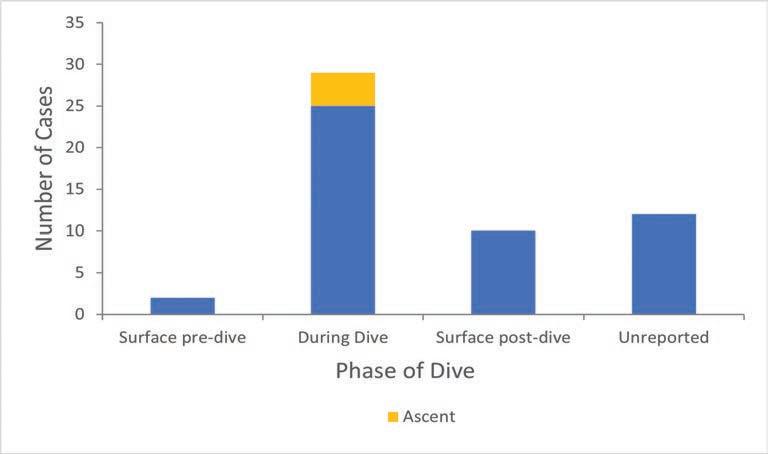 Figure 1-4. The distributions of the phase of the dive when the problem became apparent. Four of the 29 cases where the issue became apparent during the dive happened during ascent.