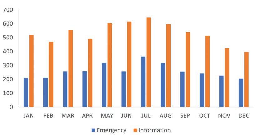 Figure 2-3. Seasonality of call volume: Count of emergency and information calls by month of the year in 2018.