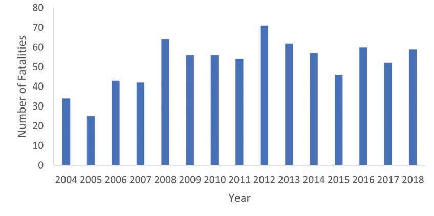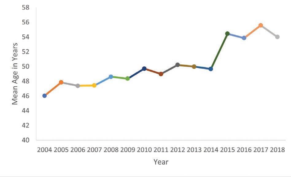 Figure 1-3. Mean age of Fatalities by year (2004–2018).