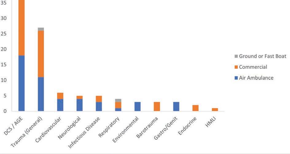 Figure 2-5. Number of evacuations by ground/boat, commercial and air broken down by health problem. HMLI, Hazardous Marine Life Injuries.