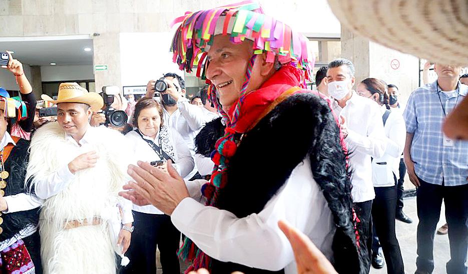 El responsable de la política del país fue vestido con la indumentaria de pueblo originario tsotsil de los Altos de Chiapas, un chuj negro de lana de borrego y un sombrero de palma con