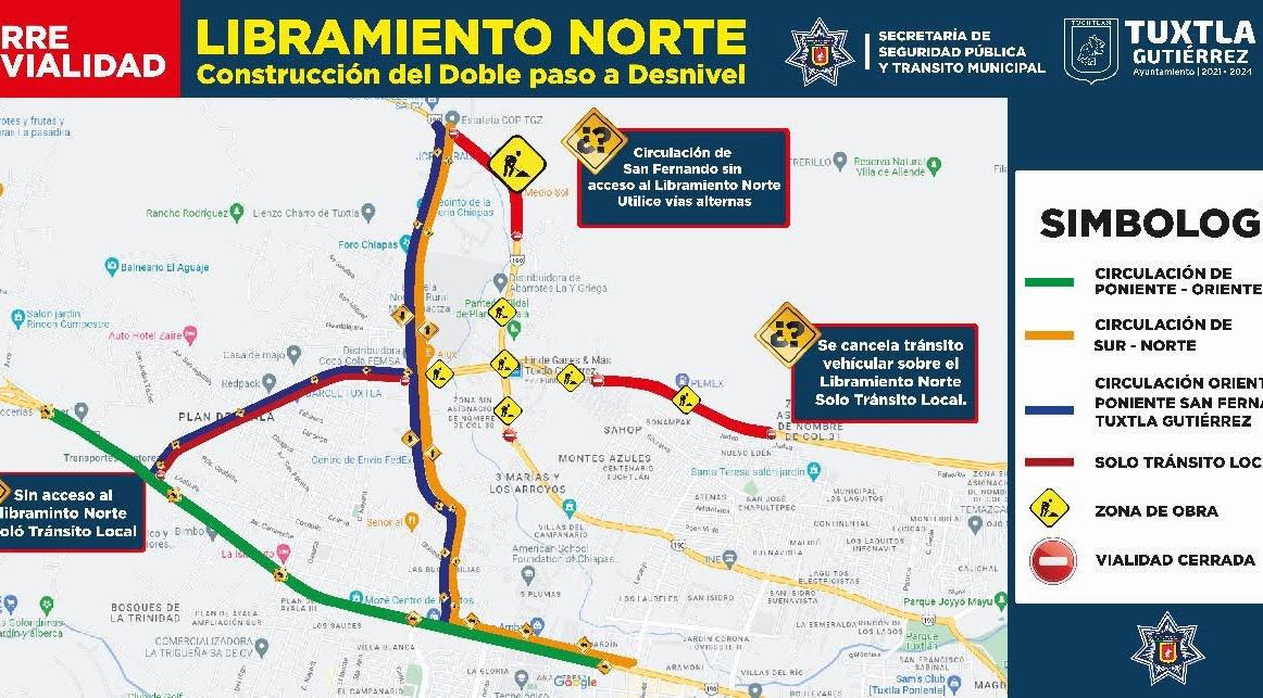 En atención al anuncio que realizara la Secre taría de Obras Públicas del Estado de Chiapas (SOP), en relación al avance de la construcción del Doble Paso a Desnivel en Tuxtla Gutiérrez; la Secretaría de Seguridad Pública Municipal informó que se man tendrá cerrada la circulación vehi cular en ambos sentidos del Libra miento Norte Poniente durante un par de semanas, a partir de este lunes 21 de noviembre.