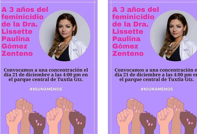 La activista y defensora de los derechos humanos, Martha Figueroa Mier, dio a conocer que este 21 de diciembre en la capital chiapaneca, habrá una concentración en el Parque Central y una conferencia de prensa sobre la Segunda Oriente Norte, para recordar los tres años del feminicidio de la doctora Lissette Paulina Gómez Zenteno.