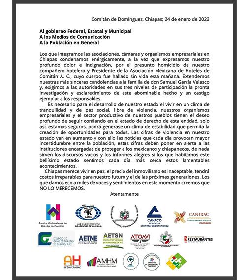 En un comunicado conjunto, expresaron que: “Los que integramos las asociaciones, cámaras y organismos empresariales en Chiapas condenamos enérgicamente, a la vez que expresamos nuestro profundo dolor e indignación, por el presunto homicidio de nuestro compañero hotelero y Presidente de la Asociación Mexicana de Hoteles de Comitán A. C., cuyo cuerpo fue hallado sin vida esta mañana”.
