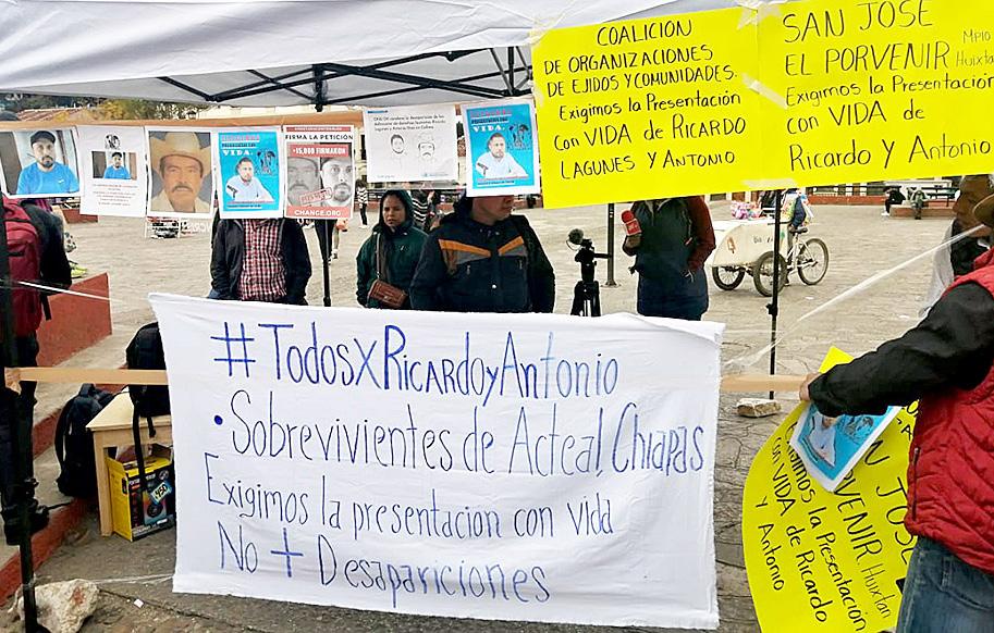 Integrantes de organizaciones, colectivos, estudiantes y Defensores de Derechos Humanos, protestaron y solidarizaron con la familia de Ricardo Arturo Lagunes y Antonio Díaz Valencia, en las instalaciones de la plaza de la Paz de San Cristóbal, para intensificar la búsqueda y presentación con vida de Antonio Díaz y Ricardo Lagunes, así como demandar que la empresa asuma su responsabilidad y ponga presión sobre el grupo minoritario que se presume está detrás de la desaparición, con el que la empresa tiene fuertes vínculos.