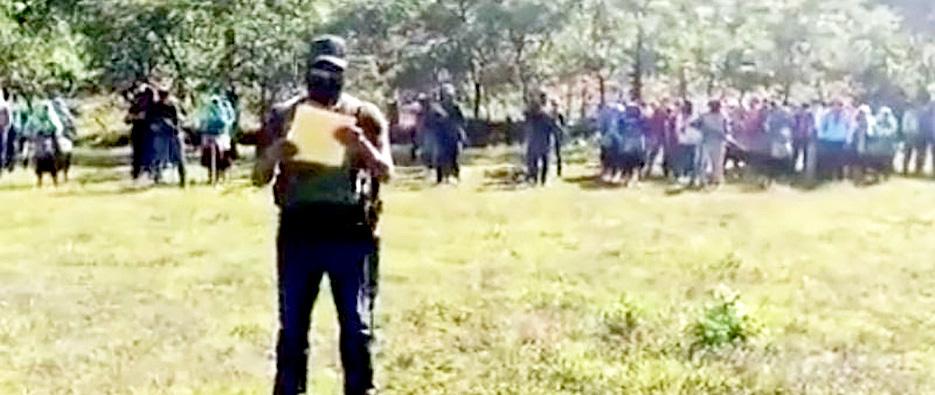 En un video un hombre encapuchado con su fusil colgado al hombro lee un comunicado con unas 200 personas detrás de él, se ven a algunos hombres también armados y mujeres en el contingente civil.
