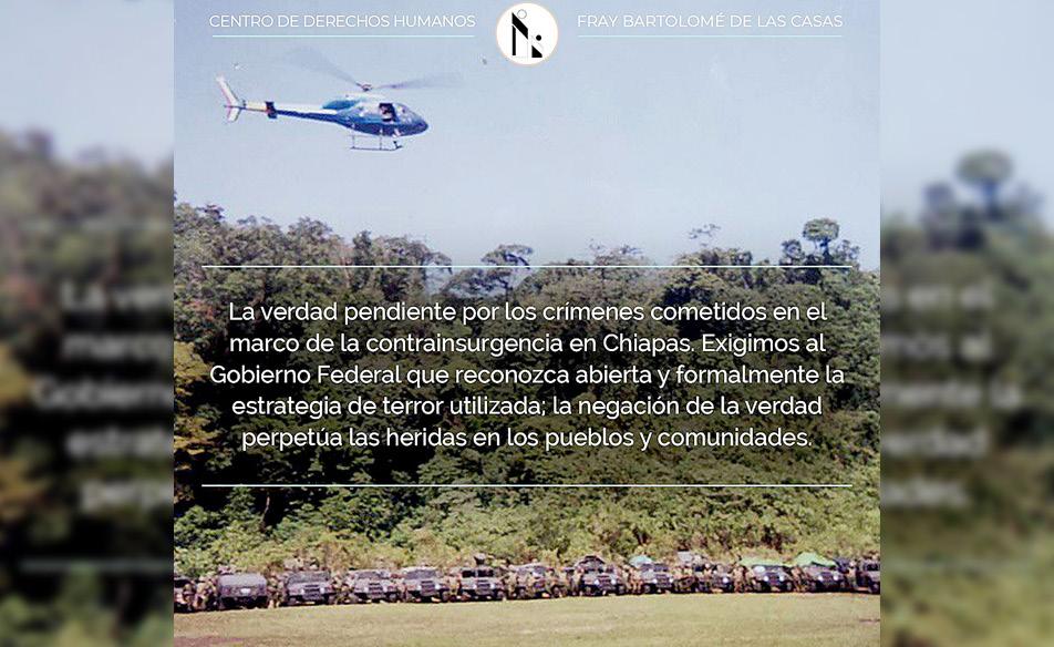 El Centro de Derechos Humanos Fray Bartolomé de Las Casas (Frayba) exigieron al Estado mexicano el reconocimiento oficial de la política contrainsurgente probada ante la Comisión Interamericana de los Derechos Humanos (CIDH), ya que de lo contrario “el gobierno en turno será un continuador de sus antecesores en la negación de la verdad y justicia, condición que prolonga los impactos psicosociales para las miles de víctimas”.
