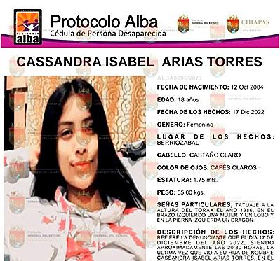 Cassandra Arias, es una joven chiapaneca de 18 años, que desapareció el 17 de diciembre de 2022, y de acuerdo a sus familiares ella es parte de las más de 111 mil personas desaparecidas en México, dado a que las autoridades no hacen el esfuerzo de investigar o/y buscarla