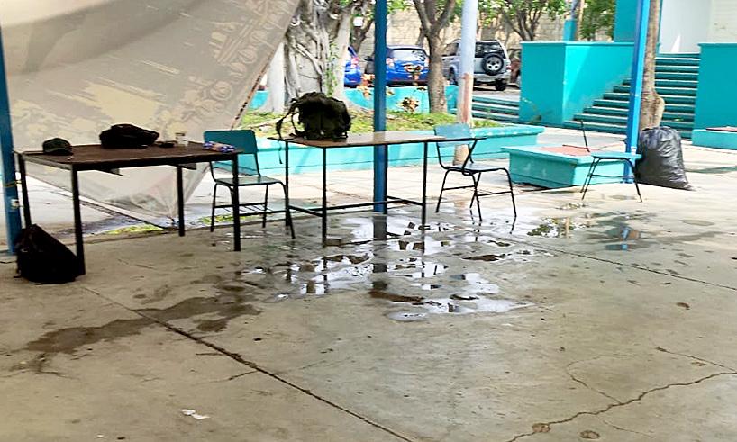 Pero además el techo al ser de lona, se acumula agua ahora en temporada de agua, y cae al suelo, lo que representa un verdadero riesgo para la integridad física de los jóvenes.