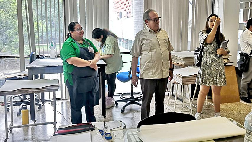 La responsable del área, Berenice Dávila Galdámez explicó al rector que en el taller se rehabilitan en promedio 800 fojas y se realizan 150 restauraciones sobre encuadernaciones.