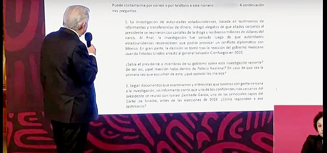 Este jueves El presidente López Obrador en la conferencia mañanera, antes de conocer el contenido de un reportaje realizado por el periódico estadounidense The New York Times sobre el presunto financiamiento del narcotráfico a la campaña electoral del presidente Andrés Manuel López Obrador en 2018, en el que asegura que funcionarios estadounidenses realizaron por años una investigación en la que descubrieron información que apunta a posibles vínculos entre el Cártel de Sinaloa y Los Zetas a asesores, hijos familiares y funcionarios cercanos al mandatario mexicano.