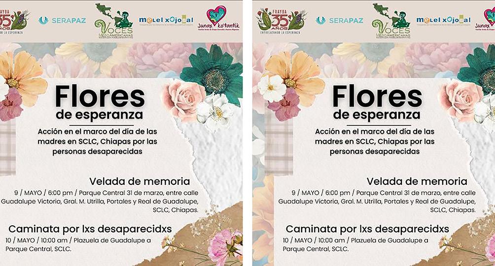 En un esfuerzo por visibilizar y recordar a las personas desaparecidas en Chiapas, diversas organizaciones sociales y de derechos humanos han anunciado la realización de dos actividades bajo el nombre “Flores de Esperanza. Actividades por las personas desaparecidas en Chiapas”.