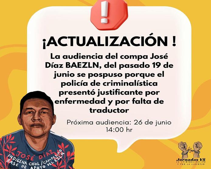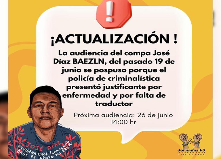 José Díaz, indígena Cho’l y miembro del BAEZLN, continúa en situación de detención arbitraria y se encuentra como rehén del Estado. Según información del Grupo de Trabajo No Estamos Todos No Estamos Todas, el 19 de junio, se iba a celebrar la audiencia de continuidad de su proceso penal de criminalización. Sin embargo, el Juez de Catazajá no garantizó el acceso de Díaz a un traductor en su lengua materna, lo que constituye una violación de los derechos humanos según el sistema penal acusatorio.
