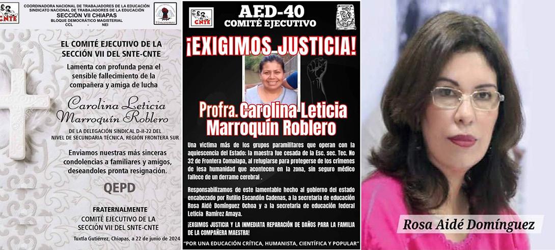 La Profesora. Carolina Leticia Marroquin Roblero, Docente de Artes, quien entregó muchos años de su vida a la labor como docente, falleció de un derrame cerebral días después de ser notificada de su cese definitivo por parte del área jurídica de la Secretaría de Educación de Chiapas. Carolina Marroquín se encontraba laborando hace pocos meses en la Esc. Sec. Tec. No. 32 de Frontera Comalapa, Chiapas, donde fue hostigada y amedrentada por quienes se dedican a reclutar a jovencitos para grupos del C. O., decidiendo huir del municipio para salvar su vida y la de su menor hijo.