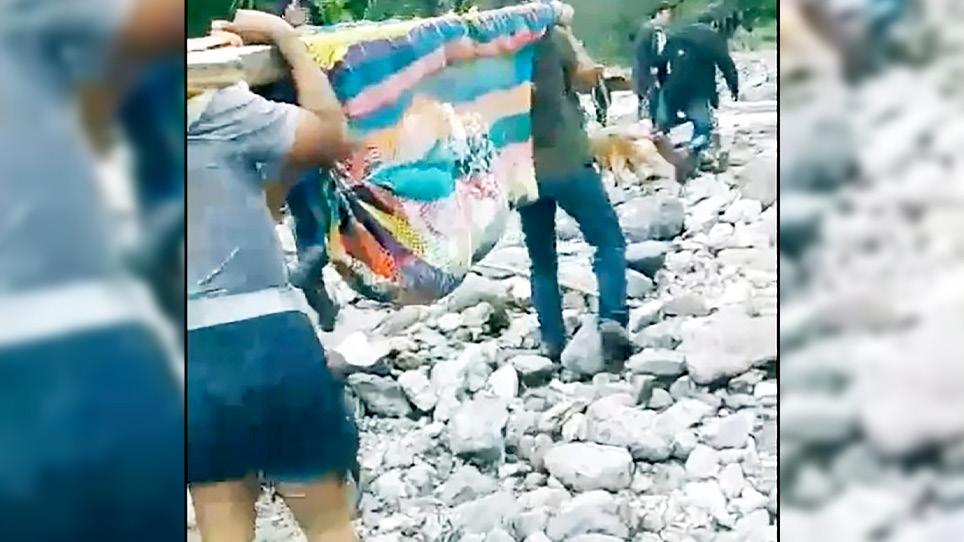 sujetaron a dos vigas de madera; es cargada en medio de un camino bloqueado por piedras y ramas de árboles. También se le ve cruzando parte de un río.