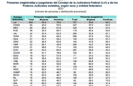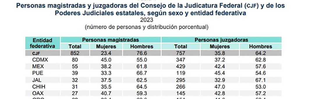 (CJF) contó con 852 personas magistradas: 199 (23.4 %) eran mujeres y 653 (76.6 %), hombres.