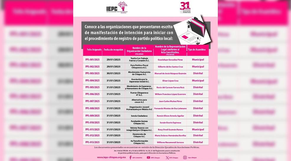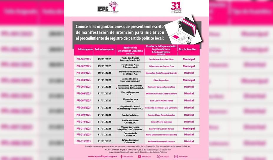 El Instituto de Elecciones y Participación Ciudadana, (IEPC), dio a conocer que son 13 organizaciones las que presentaron escrito de manifestación de intención para iniciar con el procedimiento de registro de partido político local.