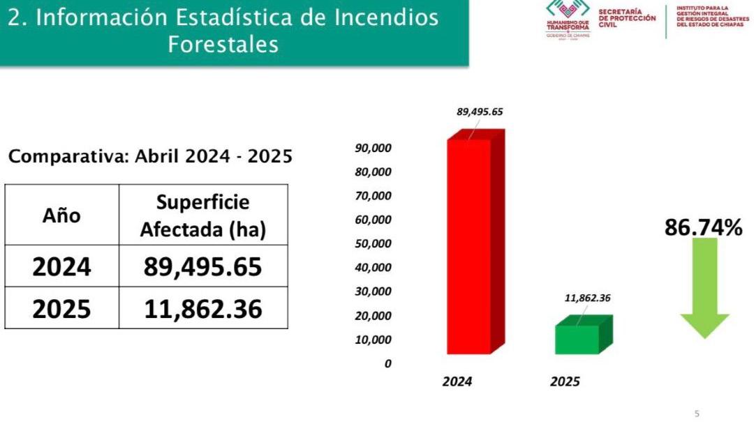 El Centro Estatal de Manejo de Fuego, con información de los Centros Regionales del Manejo de Fuego, dio a conocer en su reciente tarjeta informativa semanal, que durante el periodo de enero a abril de 2025 en Chiapas se han registrado 82 incendios forestales con 11 mil 862 hectáreas afectadas, lo que representa un 86.74 por ciento a la baja.