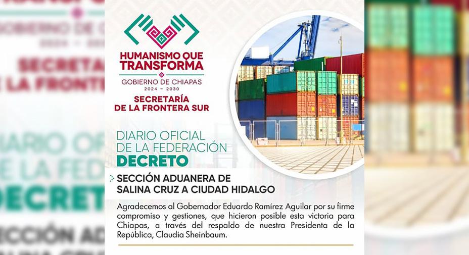 La Secretaría de la Frontera Sur, encabezada por María Amalia Toriello Elorza, celebra con gran satisfacción la publicación, este 15 de mayo de 2025 en el Diario Oficial de la Federación, del decreto que oficializa el retorno de la sección aduanera desde Salina Cruz, Oaxaca, a Ciudad Hidalgo, Chiapas.