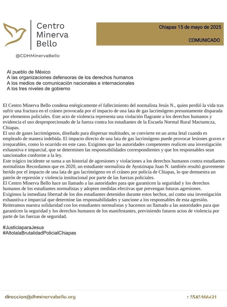 solidaridad de las otras escuelas normales rurales del país, con los riesgos de que este suceso se convierta en una protesta nacional, y más si el gobierno no separa de inmediato a los policías que participaron en este suceso, con el fin de garantizar la imparcialidad en la investigación, sobre todo, porque existe la sospecha de un centro de derechos humanos, que se caracteriza por la seriedad y su compromiso con la verdad, de que la caída del estudiante no fue un accidente sino motivada por el impacto de una lata de gas lacrimógeno, lo que puede considerarse como un homicidio y no accidente, pero esto solo puede conocerse a través de una investigación parcial, preferentemente realizada por la fiscalía general de la república, quien debe de atraer el caso por las consecuencias futuras de este hecho, que históricamente se convierte en un a agresión más a los estudiantes normalistas, en un momento en que la memoria de Ayotzinapa continúa viva.