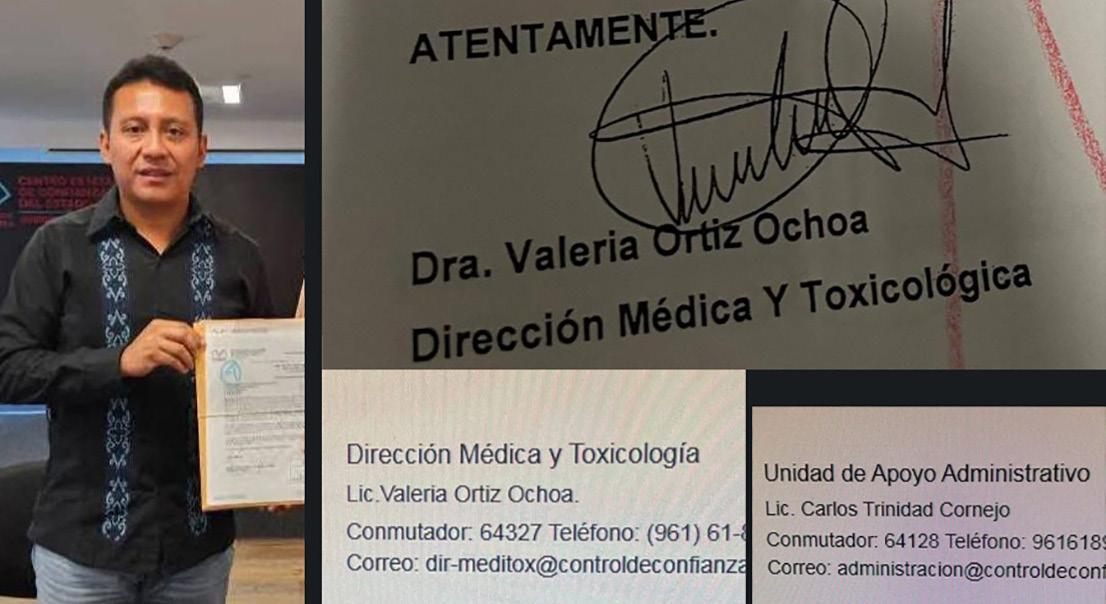 Por ejemplo, quién firma todos los exámenes, todas las evaluaciones y todas las certificaciones al personal o policías de la Fiscalía General de Justicia, de la Secretaría de Seguridad del Pueblo y de policías municipales de los 123 municipios de Chiapas, Valeria Ortiz Ochoa, NO ES DOCTORA, sino Licenciada en Nutriólogia, cuestión que no acepta y ni permite el Centro Nacional de Certificación y Acreditación (CNCA) en dónde NO HA HECHO ni RECIBIDO su Evaluación y Certificación porque ni tiene el perfil de Medico General, como se exige, pero SÍ FIRMA COMO DOCTORA.
