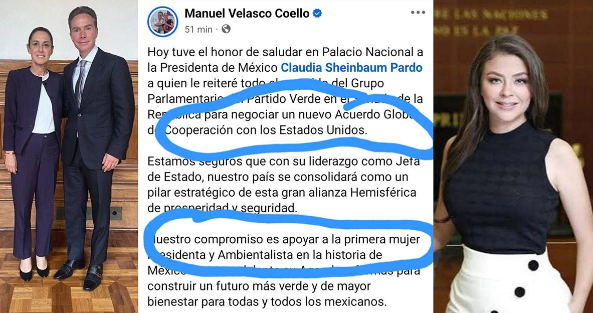 “Hoy tuve el honor de saludar en Palacio Nacional a la Presidenta de México Claudia Sheinbaum Pardo a quien le reiteré todo el respaldo del Grupo Parlamentario del Partido Verde en el Senado de la República para negociar un nuevo Acuerdo Global de Cooperación con los Estados Unidos.
