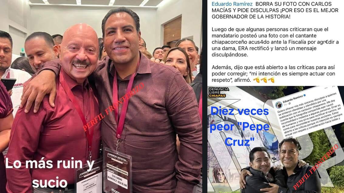 mal, no sólo le aplaude al gobernador,.hasta sus errores y excesos, sino que critica, amenaza y vilipendia a quiénes lo hacemos. Porque Chiapas y los chiapanecos DEBERÍAN SER SUS ÚNICOS COLORES y PARTIDOS, el gobernador Ramírez Aguilar no sólo DEBERÍA PRESCINDIR de esas reuniones DE MAFIOSOS DEL PASADO, sino que NO DEBERÍA FOTOGRAFIARSE y MENOS ABRAZAR a esos GRANDES CORRUPTOS, SAQUEADORES, CÍNICOS, SINVERGÜENZAS y BANDIDOS. ¿Porque su foto con Carlos Macias sí la bajó de su muro, si el “alias” de “Pepe Cruz” o “El Chafirete”, es quizás DIEZ VECES MÁS PEOR?