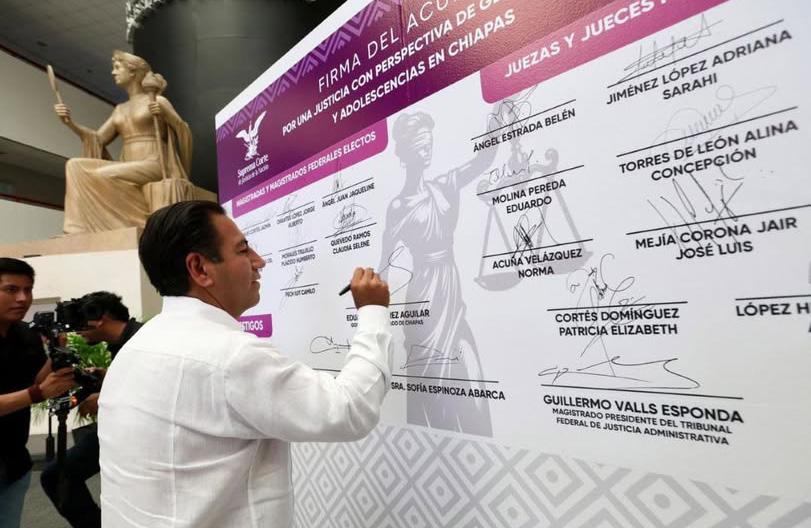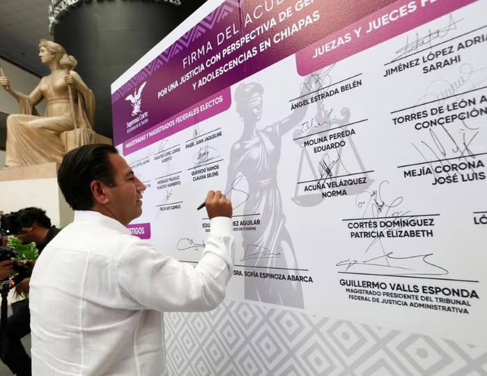 Desde las instalaciones de la sede del Poder Judicial del Estado, el gobernador constitucional Eduardo Ramírez Aguilar atestiguó la Firma del Acuerdo por una Justicia con Perspectiva de Género, Niñeces y Adolescencias en Chiapas, generada junto a la Colectiva 50+1, con el objetivo de consolidar el trabajo de las y los jueces y magistrados federales electos, por una justicia más humana, incluyente y cercana a las personas.