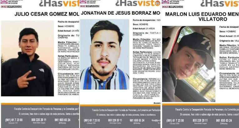 En la noche del viernes 15 de agosto tres jóvenes desaparecieron en distintos puntos de la capital chiapaneca lo que ha provocado alerta, preocupación, angustia y conmoción entre sus familiares y la sociedad capitalina, sin que hasta el momento las autoridades correspondientes conozcan a ciencia cierta su paradero. Los desaparecidos responden a los nombres de Jonathan de Jesús Borraz Moguel, Julio César Gómez Molina y Marlon Luis Eduardo Mendizábal Villatoro.