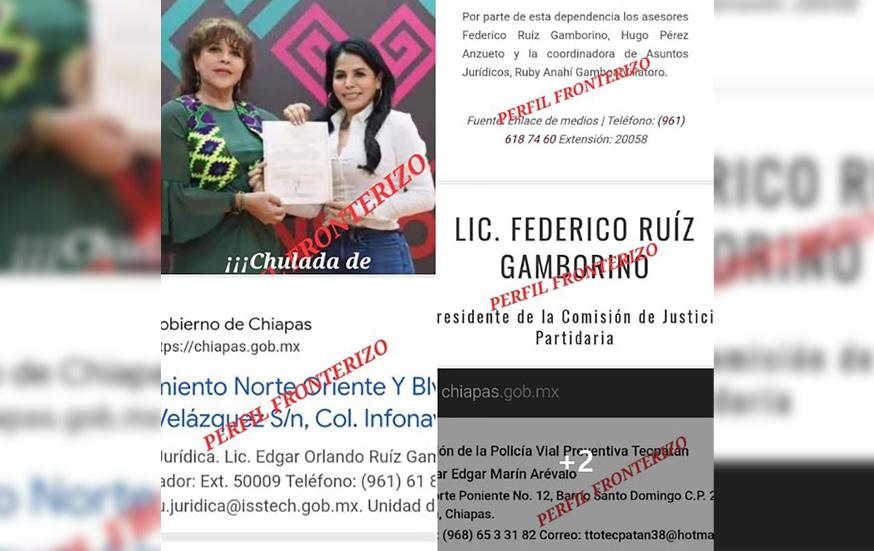 A Federico Ruiz Gamborino, expresidente de la Comisión de Justicia Partidaria del Comité Directivo Estatal del PRI en Chiapas, lo tiene COMO ASISTENTE o ASESOR (así se lee en un boletín oficial) en la Secretaría General de Gobierno, y, el otro sobrino, Edgar Orlando Ruiz Gamborino, lo tiene laborando como JEFE de LA UNIDAD JURÍDICA del ISSTECH, por cuya INFLUENCIA, COMPADRAZGO o COMPLICIDAD que tiene con María del Carmen (“Carmelita”) Fernández Benavente. ¡¡¡Qué “chulada” de “Humanismo que Transforma”!!!, ¿Verdad? Siguiendo con las TURBIAS ACCIONES, RECOMENDACIONES, NEPOTISMOS, IMPOSICIONES o CORRUPCIONES de quién dice se encarga de la “estabilidad y gobernabilidad” de Chiapas y anda haciendo sus “corazoncitos” con las manos por todos lados, no sólo es MADRINA