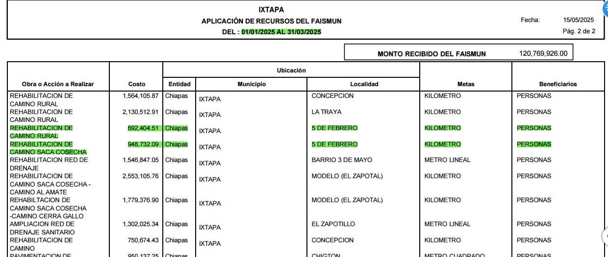 Entre los contratos que señalan los pobladores destacan: Camino rural, rehabilitación por $692,404.51 en la comunidad 5 de Febrero.