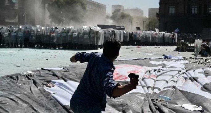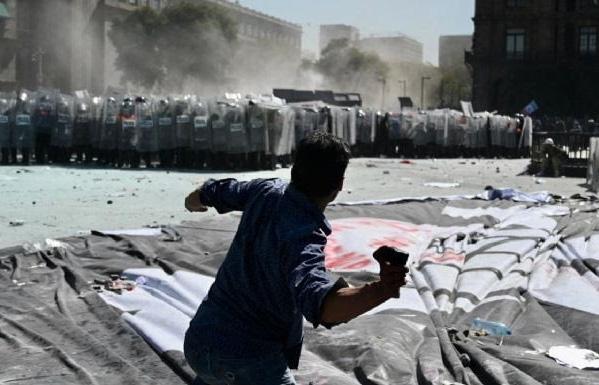 En el Zócalo de la Ciudad de México se registraron escenas de represión policiaca que subieron de manera intempestiva de tono cuando encapuchado o embozados especialistas en crear desorden, como los que paga el gobierno local de Clara Brugada, comenzaron a escalar los vayas de acero de tres metros de altura para resguardar Palacio Nacional, mismo que fueron repelidos con extintores, pero los sujetos lograron derribar las planchas de metal.