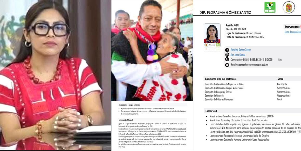 SEGUNDA. Flor Alma Gómez Santis originaria del municipio de Oxchuc, fue diputada local por el partido Verde Ecologista, representando al distrito XXI en la LXVIII Legislatura -cuando el indolente gobernador Rutilio Escandón Cadenas-, desempeñándose EN LAS COMISIONES de Atención a la Mujer y a la Niñez, Atención a Grupos Vulnerables, de Bosques y Selvas, de Vivienda, de Culturas Populares…
