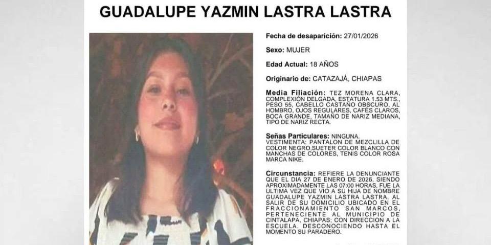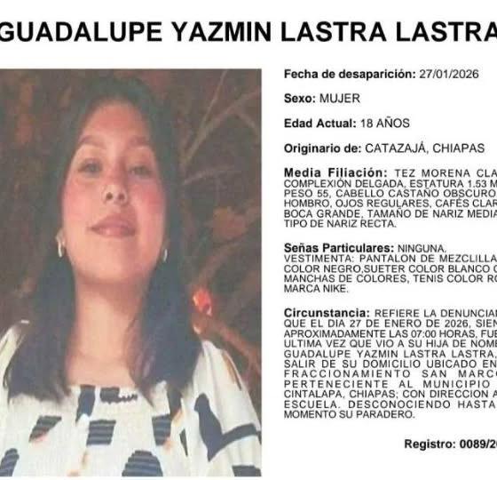La Fiscalía General del Estado (FGE) de Chiapas emitió una ficha de búsqueda para la localización de Guadalupe Yazmín Lastra Lastra, desaparecida el pasado 27 de enero en el municipio chiapaneco de Cintalapa. Guadalupe Yazmín es descrita como una mujer de 18 años, de tez morena clara, cabello castaño oscuro y mide 1.53 metros. Al momento de su desaparición vestía un pantalón de mezclilla de color negro, suéter blanco con manchas de colores y tenis de color rosa.