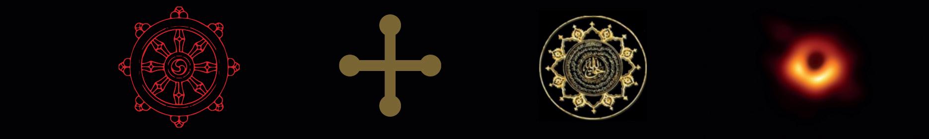 Omslagets baksidas småbilder med symboler (i tidsordning) som de nio mystikerna lever i och med: Buddhistiskt hjul (med ekrar från ett nav för den åttafaldiga vägen); kristet kors (variant av det vanliga kristna korset, s.k. kulkors); islams mystika sufism (tre cirklar med åtta krön); den moderna vetenskapens så kallade svarta hål (den yttersta gränsen för dess medvetande).