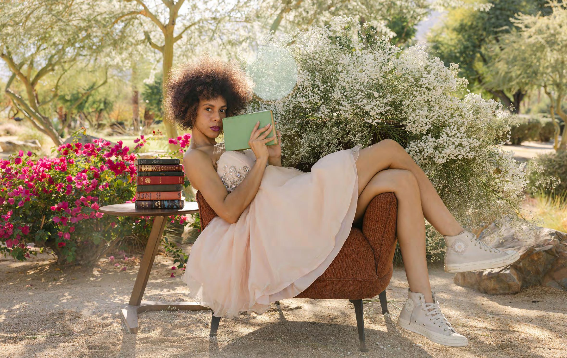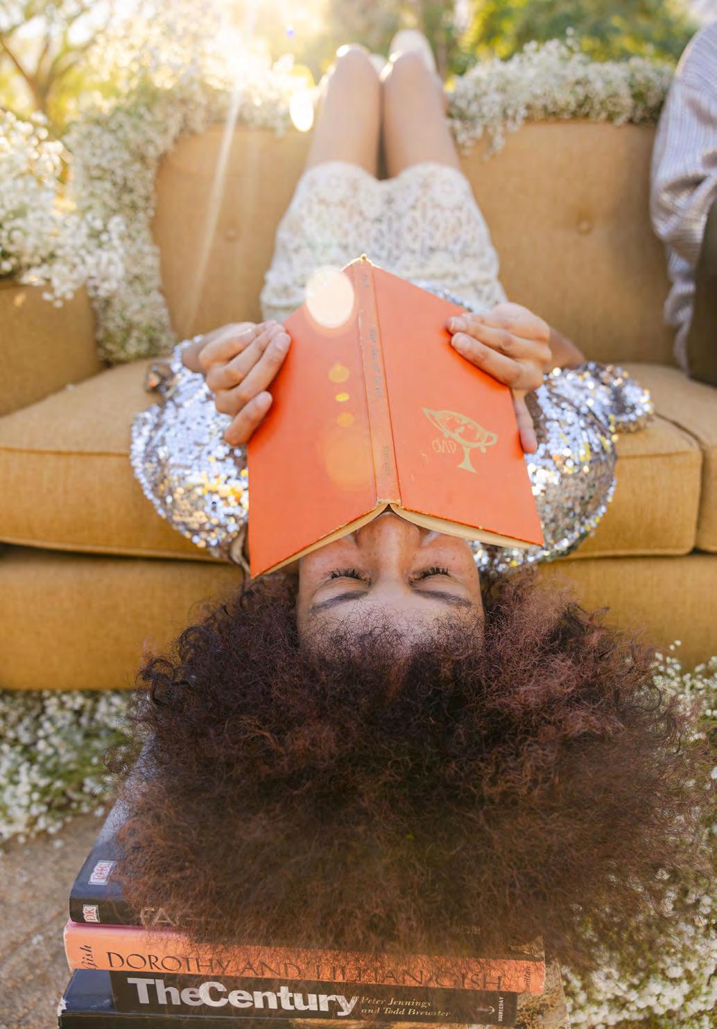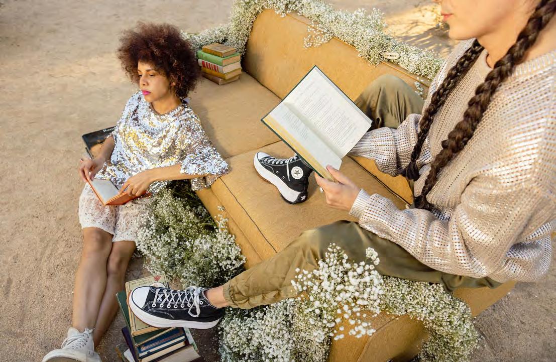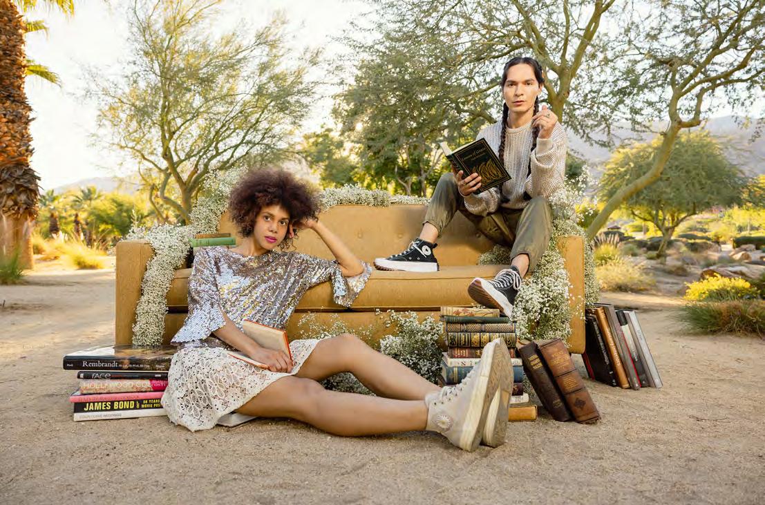 The initial photo shoot took place in Ruth Hardy Park and showcased a selection from Revivals’ extensive collection of books. “We arranged the books in stacks and considered how people typically enjoy reading — often lounging on a couch,” explains Doughty. “Our goal was to create a sense of familiarity while also introducing an element of surprise. In several shots, the model is captured upside down on the couch, bringing an unexpected twist to the outdoor setting.”