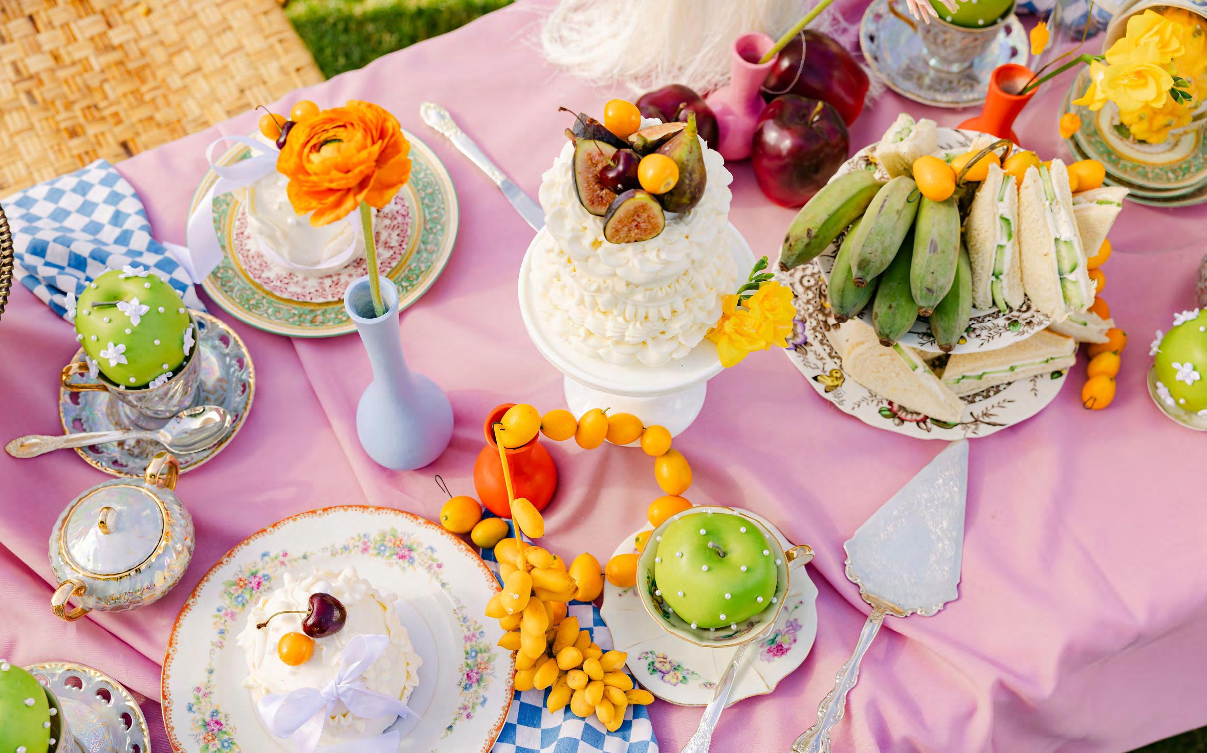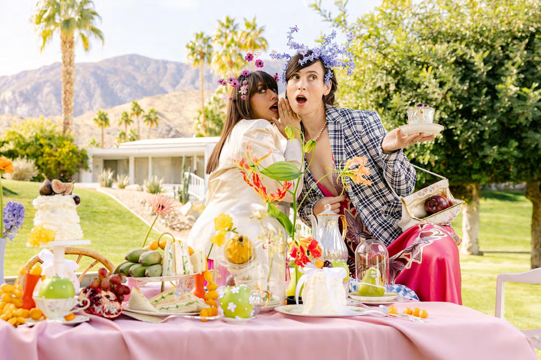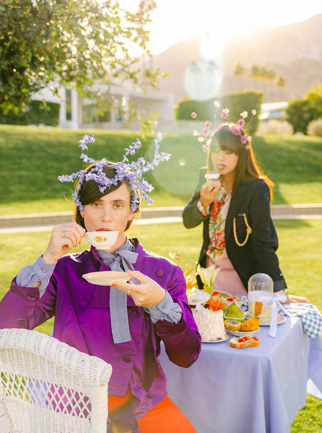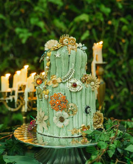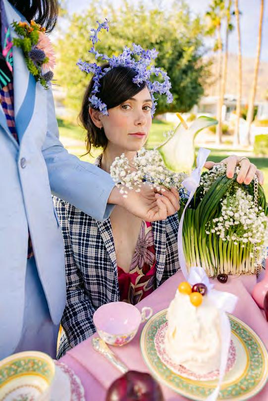 Doughty, who served as creative director for the project, incorporated her unique floral designs and other imaginative touches into the photos. In one, a model wears a delicate flower crown. In another, a closer look at a frosted, cactus-shaped cake reveals it’s decorated with vintage brooches found at the store.