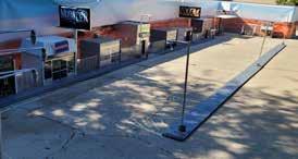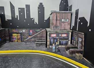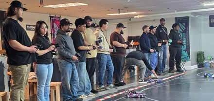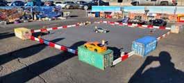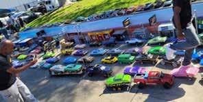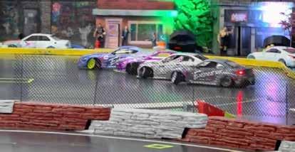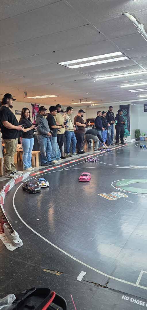 a simple track. The centerpiece was an RC scale drift-burnout pit built on carpet, with scale barriers, entry and exit gates, and the details that sell the illusion, traffic cones, J barriers, and scale Conex boxes covered in street art. Surrounding it was a full RC Scale Town with handmade buildings and an RCsized parking lot to mimic a real car meet. Chris and Cory hosted the setup, but made it clear it wasn’t their space, it was the community’s. Local RC enthusiasts came through, and people traveled in from out of state too, including guests from Colorado and New Mexico. The driver crew from Tandem RC even made a guest appearance to put on a drifting display.