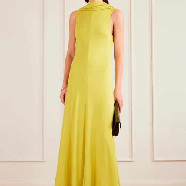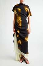 Following the seasonal theme of ‘a soft undoing,’ asymmetric panels of smooth stretch cady unfurl across this runway-showcased dress that cascades into a contrast slip, creating gentle tension between color and form.