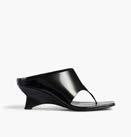 An elevated expression of the toe-post sandal, defined by subtle curves, elegant asymmetry, and a sculpted wedge heel. Designed for all-day comfort with natural instep support and a goatskin lining. Crafted in Italy of supple and luminous baby calfskin. Signature staple detail at outsole.
