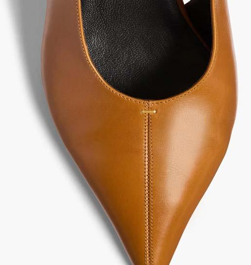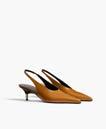 A pointed-toe slingback heel defined by decisive lines, exquisite materials, and sublime details, including signature Empire hardware of 18-karat-gold-plated brass that tips the sculpturally wrapped wedge heel.