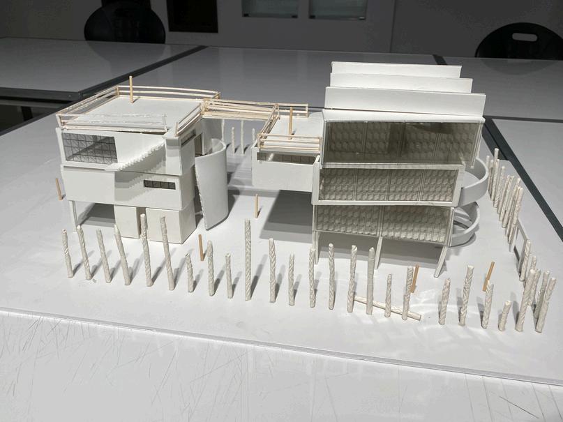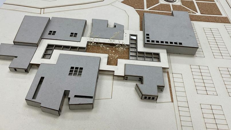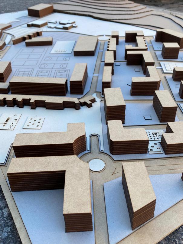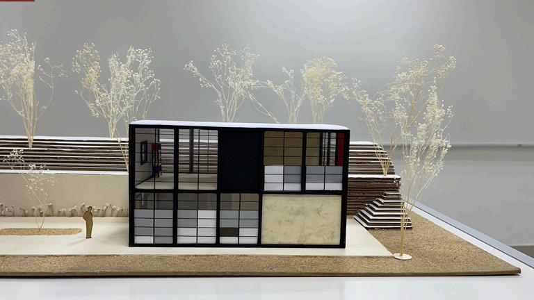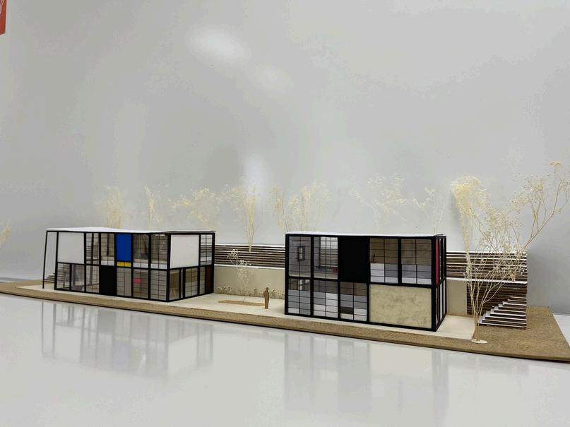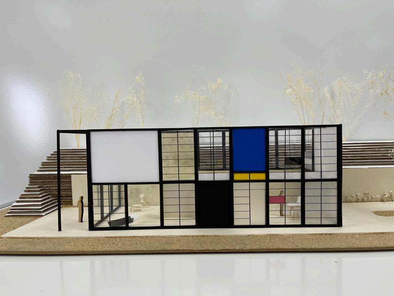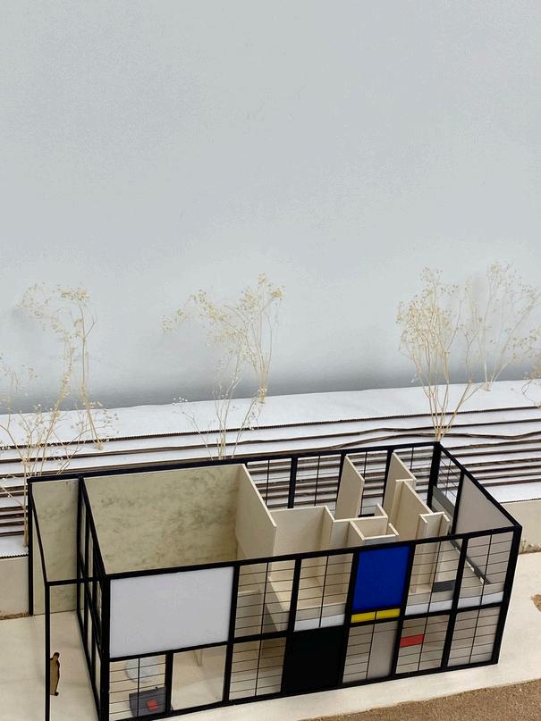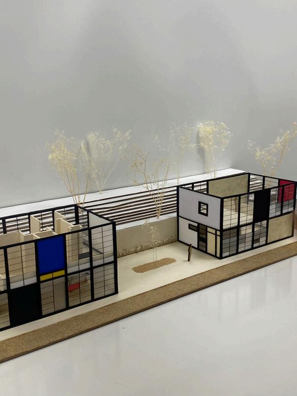 Para esta maqueta se utilizó cartón para la topografía , cartón batería para el muro de contención y la base, cartón blanco pintado para la herrería, acetato para los cristales y opalina de distintos colores para los detalles en fachadas que simulan cuadros de Mondrian.