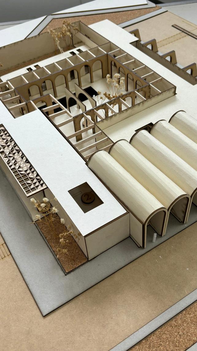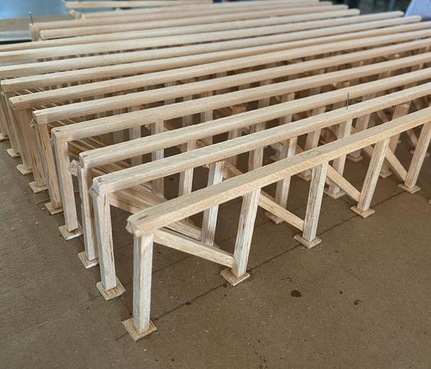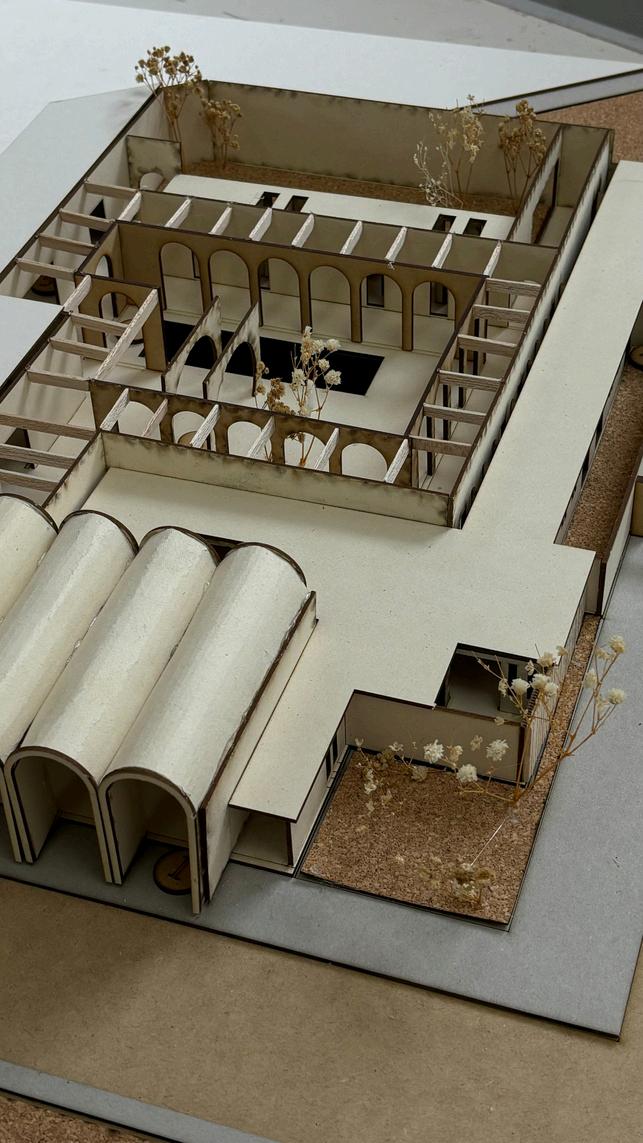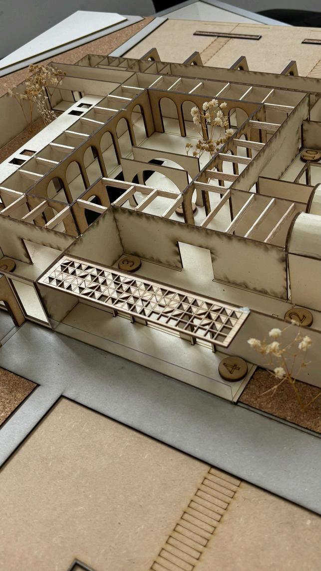 Este modelo fue trabajado con trovicel (lámina de PVC espumado) en su mayoría Algunos detalles como la vegetación exterior están hechos de arcilla blanca. Las ventanas son de acetato impreso para simular la herrería.