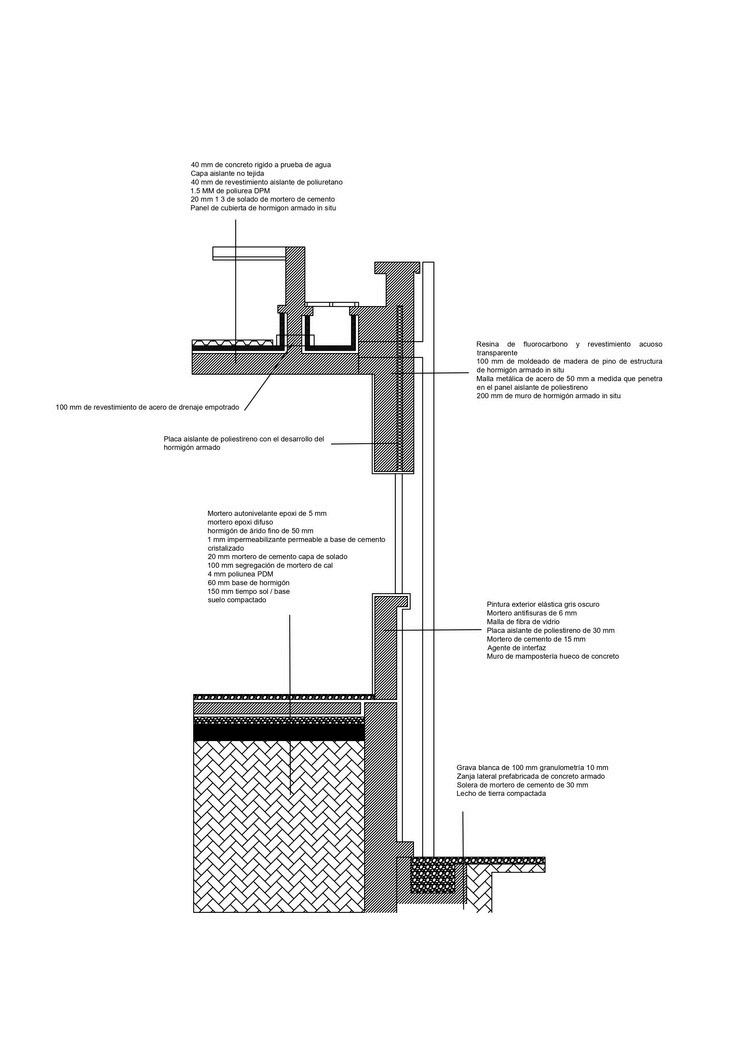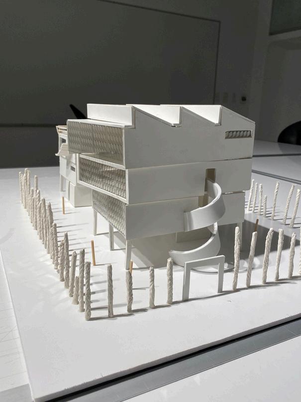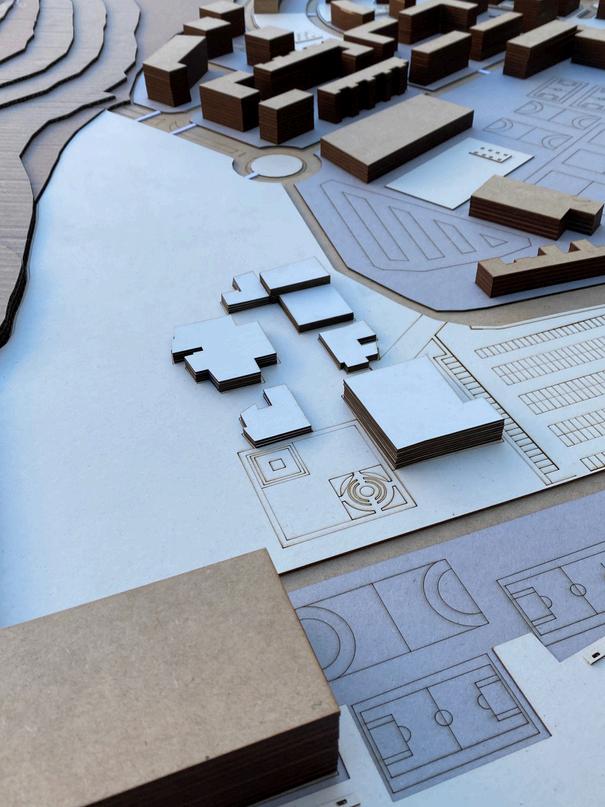 Para esta maqueta se utilizó cartón para la topografía , cartón batería para el muro de contención y la base, cartón blanco pintado para la herrería, acetato para los cristales y opalina de distintos colores para los detalles en fachadas que simulan cuadros de Mondrian.