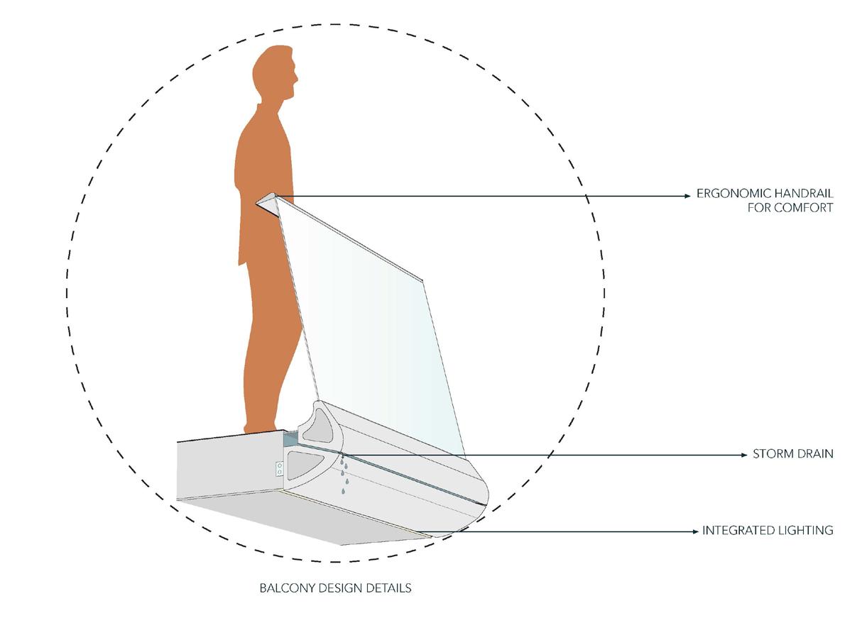 Material distinctions ehance spatial use brick panels define social balconies, while verticallouvers maintain privacy at the rear