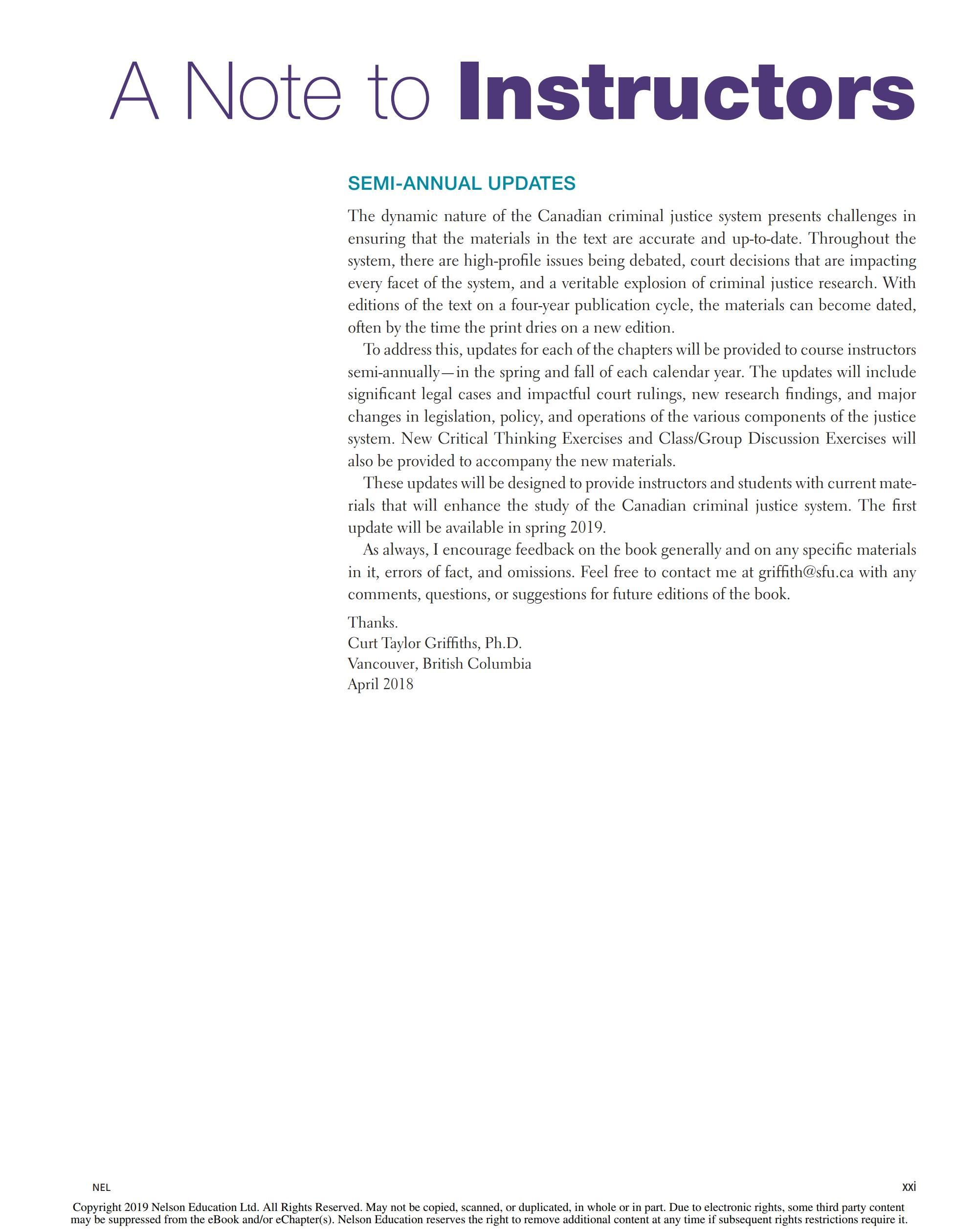 T h ese upd a t es will b e d es ig n e d t o pr ov id e in stru c to rs a11d stud e 11ts with c urr e 11t 1n a t eri a ls th at will e nh a n ce th e stud y of th e C an a di a n c rimin a l ju sti ce sys t e m . T l1 e fi rst upd at e will b e ava il abl e in spri11g 20 19.