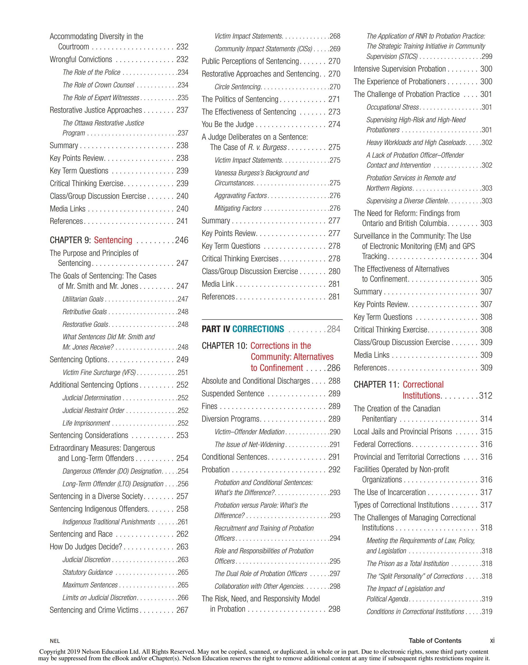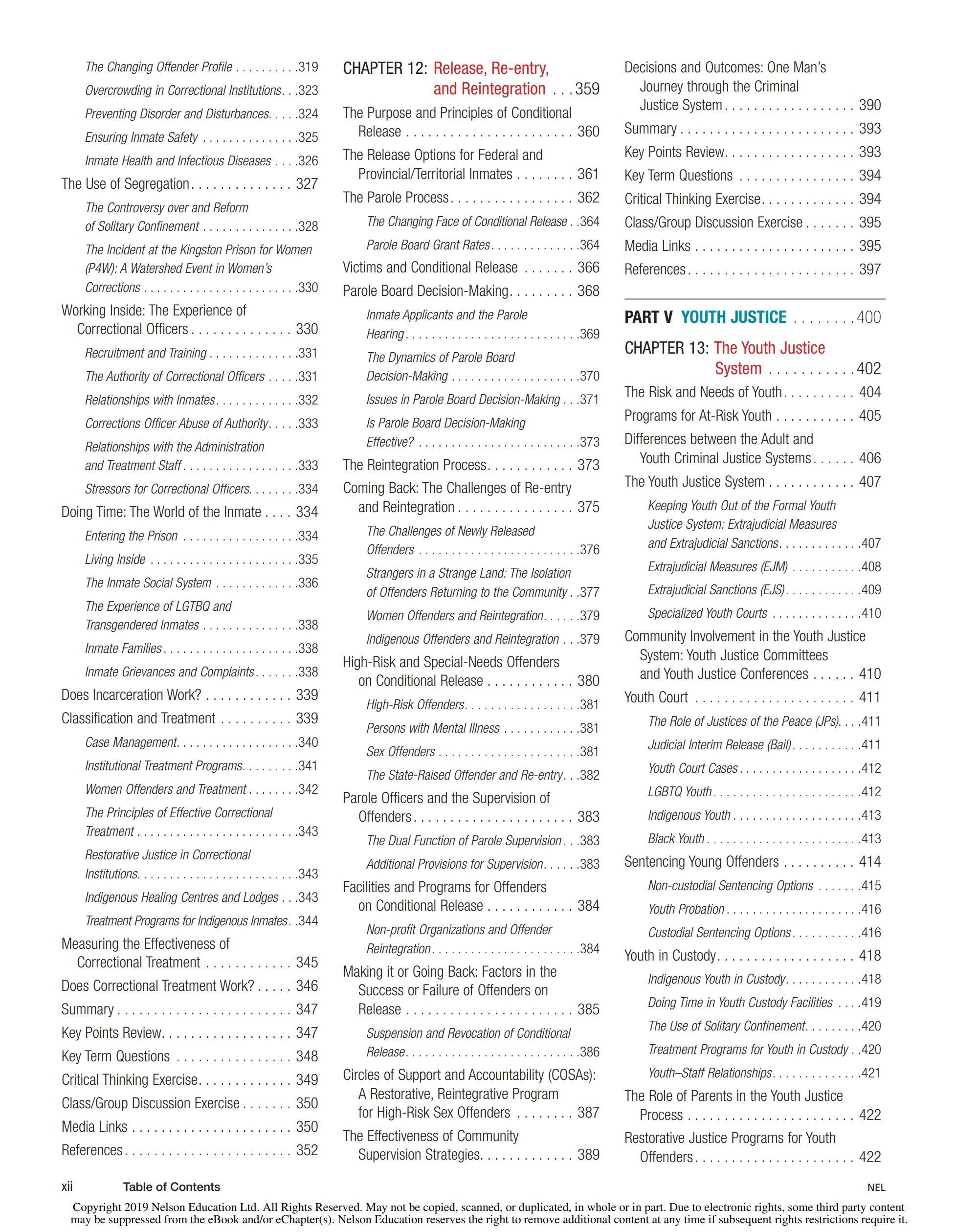 Pa rt IV co nt a in s thr ee c l1apt e rs tl1 a t foc u s o n C a n a di a 11 c orr ec tio11 s Chapte r 10 di sc u sses co rr ec ti o n a l alte rnati ves to co nfi11 e m e nt ; Ch apte r 11 rev ievvs c orr ec tional in stituti o n s; and C l1 apt e r 12 exa min es tl1 e r el ease 7 r e-e ntry7 a11d re i11t eg rati o n of offe11d e rs i11to th e c om 1nuni ty .