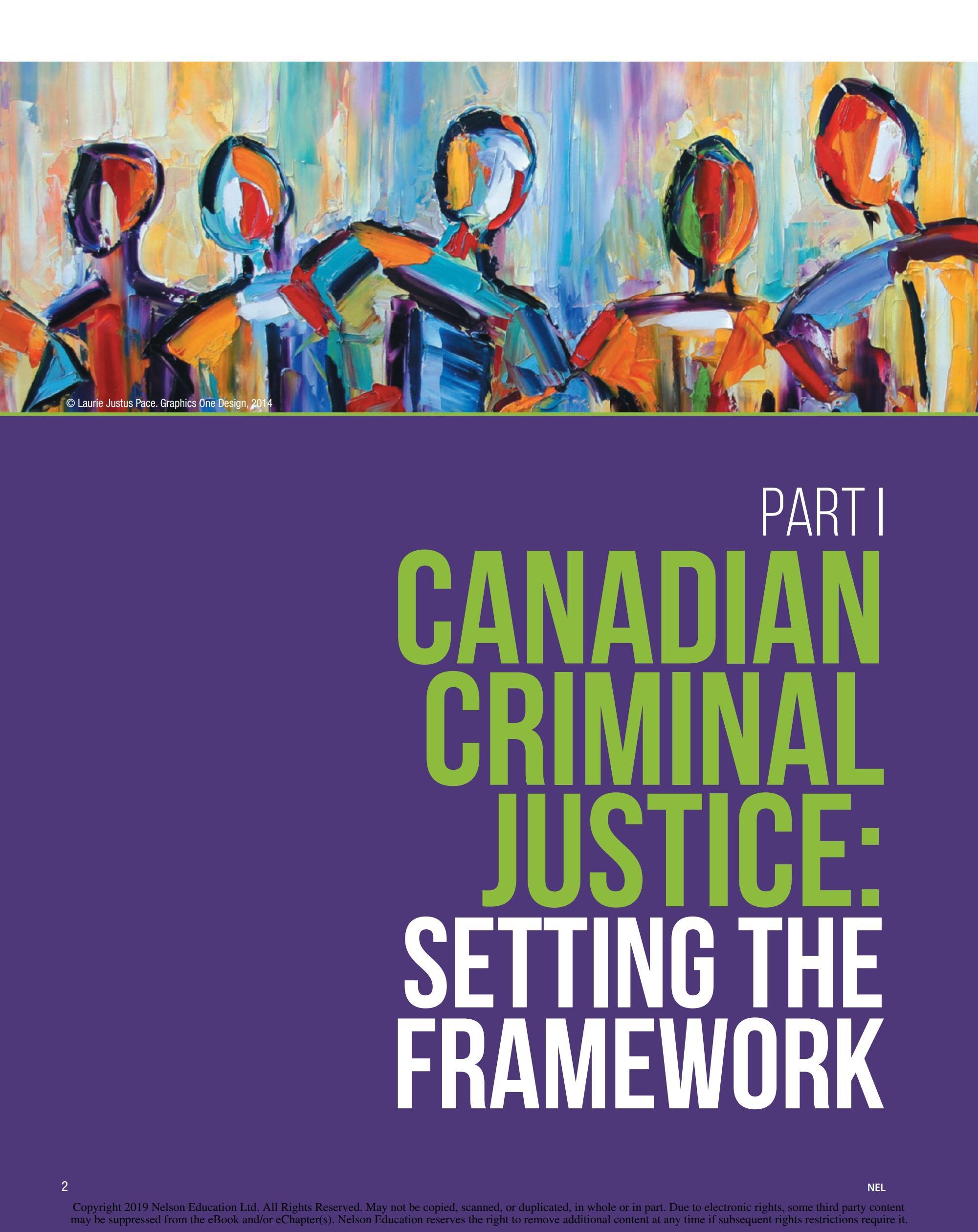 T h ese cases all occ urr e d in th e p as t few yea rs a11d pr ov id e a snap sh ot of th e dyn a1ni c natur e of th e c ri1nin a l ju sti ce sys t e 1n and th e co n1pl ex iss u es that surr o und its op e ratio11 . T h e tl1r ee c l1 a pt e rs in thi s p a rt a re d es ig11 e d t o se t th e fra1n ewo rk fo r th e stud y of tl1 e Ca n a di a n c riminal ju sti ce sys t e1n . C l1apt e r 1 se ts out th e fo undati o 11 of tl1 e lega l sys t e1n a nd di sc u sses tl1e ori gin s a11d appli c ati o 11 of tl1 e c rimina l law. It is 11 o te d that wh o a nd wl1 at ar e d e fin e d as cr i1ni11 a l is eve r- c l1 a n g i11 g a nd tl1 a t , in a d e mo c ra ti c so c iety, t e nsion s oft e n ex ist betwee n th e c rimi11 a l law a11d th e ri ghts of indi viduals C hapt e r 2 pr ov id es info r1n ati on t o und e rstand tl1 e c riminal ju sti ce sys t e m , in c ludin g its purp ose, th e c omp e ti11g 1no d e ls of c riminal ju sti ce a d111ini strati o11, th e fl ow of cases tl1r o u gl1 tl1 e sys t e m , and a di sc u ss io11 of th e e ffec ti ve 11 ess of th e sys t e1n T l1 e 1nate ri als in Cl1apte r 3 are pr ese nte d to prov id e a b ac kdr op for th e study of C an adi a n c rimin al justi ce T h e re is a di sc u ss ion of i11 e qu ali ty, rac is1n and di sc rimi11 ati on , and th e li ve d exp e ri e n ces of Indi ge n ou s p eo pl es, ra cializ e d group s, and pe rso ns in visib le/c ultural/relig ious mi11 oriti es. A nt11nb e r of a dditi o11al iss u es th at surrou11d tl1 e crimi11 al justi ce sys te m are al so id e ntifi ed a11d di sc usse